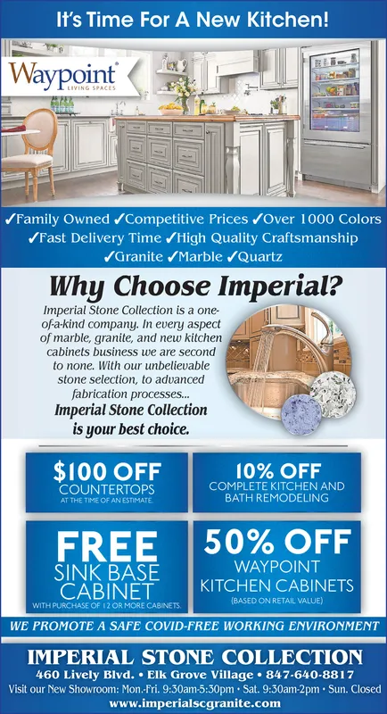 It's Time For A New Kitchen! Waypoint LIVING SPACES Family Owned /Competitive Prices /Over 1000 Colors Fast Delivery Time /High Quality Craftsmanship /Granite /Marble /Quartz Why Choose Imperial? Imperial Stone Collection is a one- of a-kind company. In every aspect of marble, granite, and new kitchen cabinets business we are second to none. With our unbelievable stone selection, to advanced fabrication processes. Imperial Stone Collection is your best choice. $100 OFF COUNTERTOPS 10% OFF COMPLETE KITCHEN AND BATH REMODELING AT THE TIME OF AN ESTIMATE FREE 50% OFF SINK BASE CABINET WITH PURCHASE OF 12 OR MORE CABINETS. WAYPOINT KITCHEN CABINETS (BASED ON RETAIL VALUE) WE PROMOTE A SAFE COVID-FREE WORKING ENVIRONMENT IMPERIAL STONE COLLECTION 460 Lively Blvd. Elk Grove Village 847-640-8817 Visit our New Showroom: Mon.-Fri. 9:30am-5:30pm · Sat. 9:30am-2pm · Sun. Closed www.imperialscgranite.com It's Time For A New Kitchen! Waypoint LIVING SPACES Family Owned /Competitive Prices /Over 1000 Colors Fast Delivery Time /High Quality Craftsmanship /Granite /Marble /Quartz Why Choose Imperial? Imperial Stone Collection is a one- of a-kind company. In every aspect of marble, granite, and new kitchen cabinets business we are second to none. With our unbelievable stone selection, to advanced fabrication processes. Imperial Stone Collection is your best choice. $100 OFF COUNTERTOPS 10% OFF COMPLETE KITCHEN AND BATH REMODELING AT THE TIME OF AN ESTIMATE FREE 50% OFF SINK BASE CABINET WITH PURCHASE OF 12 OR MORE CABINETS. WAYPOINT KITCHEN CABINETS (BASED ON RETAIL VALUE) WE PROMOTE A SAFE COVID-FREE WORKING ENVIRONMENT IMPERIAL STONE COLLECTION 460 Lively Blvd. Elk Grove Village 847-640-8817 Visit our New Showroom: Mon.-Fri. 9:30am-5:30pm · Sat. 9:30am-2pm · Sun. Closed www.imperialscgranite.com