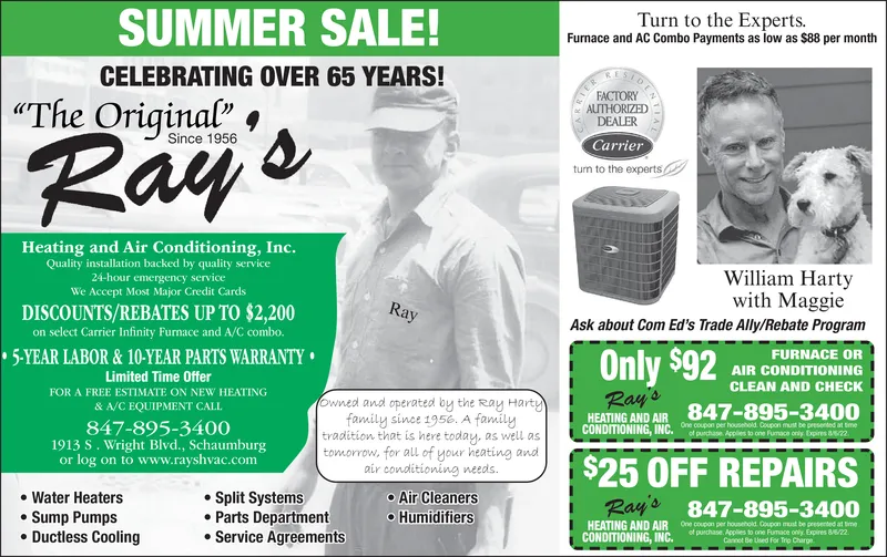 SUMMER SALE! CELEBRATING OVER 65 YEARS! "The Original" Ray's Heating and Air Conditioning, Inc. Quality installation backed by quality service 24-hour emergency service We Accept Most Major Credit Cards DISCOUNTS/REBATES UP TO $2,200 on select Carrier Infinity Furnace and A/C combo. 5-YEAR LABOR & 10-YEAR PARTS WARRANTY Limited Time Offer FOR A FREE ESTIMATE ON NEW HEATING & A/C EQUIPMENT CALL 847-895-3400 1913 S. Wright Blvd., Schaumburg or log on to www.rayshvac.com Water Heaters Sump Pumps Ductless Cooling Ray owned and operated by the Ray Harty family since 1956. A family tradition that is here today, as well as tomorrow, for all of your heating and air conditioning needs. Air Cleaners Humidifiers Split Systems Parts Department Service Agreements Turn to the Experts. Furnace and AC Combo Payments as low as $88 per month FACTORY AUTHORIZED DEALER Carrier turn to the experts/ William Harty with Maggie Ask about Com Ed's Trade Ally/Rebate Program FURNACE OR Only $92 AIR CONDITIONING CLEAN AND CHECK Ray's HEATING AND AIR 847-895-3400 CONDITIONING, INC. One coupon per household Coupon must be presented at time of purchase. Applies to one fumace only Expires 7/15/22 $25 OFF REPAIRS Ray's 847-895-3400 HEATING AND AIR CONDITIONING, INC. One coupon per household Coupon must be presented at time of purchase. Applies to one Fumace only. Expires 7/15/22 Cannot Be Used For Trip Charge SUMMER SALE ! CELEBRATING OVER 65 YEARS ! " The Original " Ray's Heating and Air Conditioning , Inc. Quality installation backed by quality service 24 - hour emergency service We Accept Most Major Credit Cards DISCOUNTS / REBATES UP TO $ 2,200 on select Carrier Infinity Furnace and A / C combo . 5 - YEAR LABOR & 10 - YEAR PARTS WARRANTY Limited Time Offer FOR A FREE ESTIMATE ON NEW HEATING & A / C EQUIPMENT CALL 847-895-3400 1913 S. Wright Blvd. , Schaumburg or log on to www.rayshvac.com Water Heaters Sump Pumps Ductless Cooling Ray owned and operated by the Ray Harty family since 1956. A family tradition that is here today , as well as tomorrow , for all of your heating and air conditioning needs . Air Cleaners Humidifiers Split Systems Parts Department Service Agreements Turn to the Experts . Furnace and AC Combo Payments as low as $ 88 per month FACTORY AUTHORIZED DEALER Carrier turn to the experts / William Harty with Maggie Ask about Com Ed's Trade Ally / Rebate Program FURNACE OR Only $ 92 AIR CONDITIONING CLEAN AND CHECK Ray's HEATING AND AIR 847-895-3400 CONDITIONING , INC . One coupon per household Coupon must be presented at time of purchase . Applies to one fumace only Expires 7/15/22 $ 25 OFF REPAIRS Ray's 847-895-3400 HEATING AND AIR CONDITIONING , INC . One coupon per household Coupon must be presented at time of purchase . Applies to one Fumace only . Expires 7/15/22 Cannot Be Used For Trip Charge